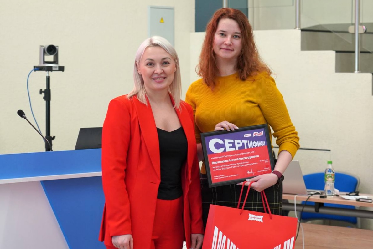 Победителем программы среди преподавателей стала Анна Вертинова, доцент кафедры экономики и управления. Преподаватель получила грант в размере 250 000 рублей на реализацию своих профессиональных идей в рамках программы «Альфа-Будущее. Гранты преподавателям».