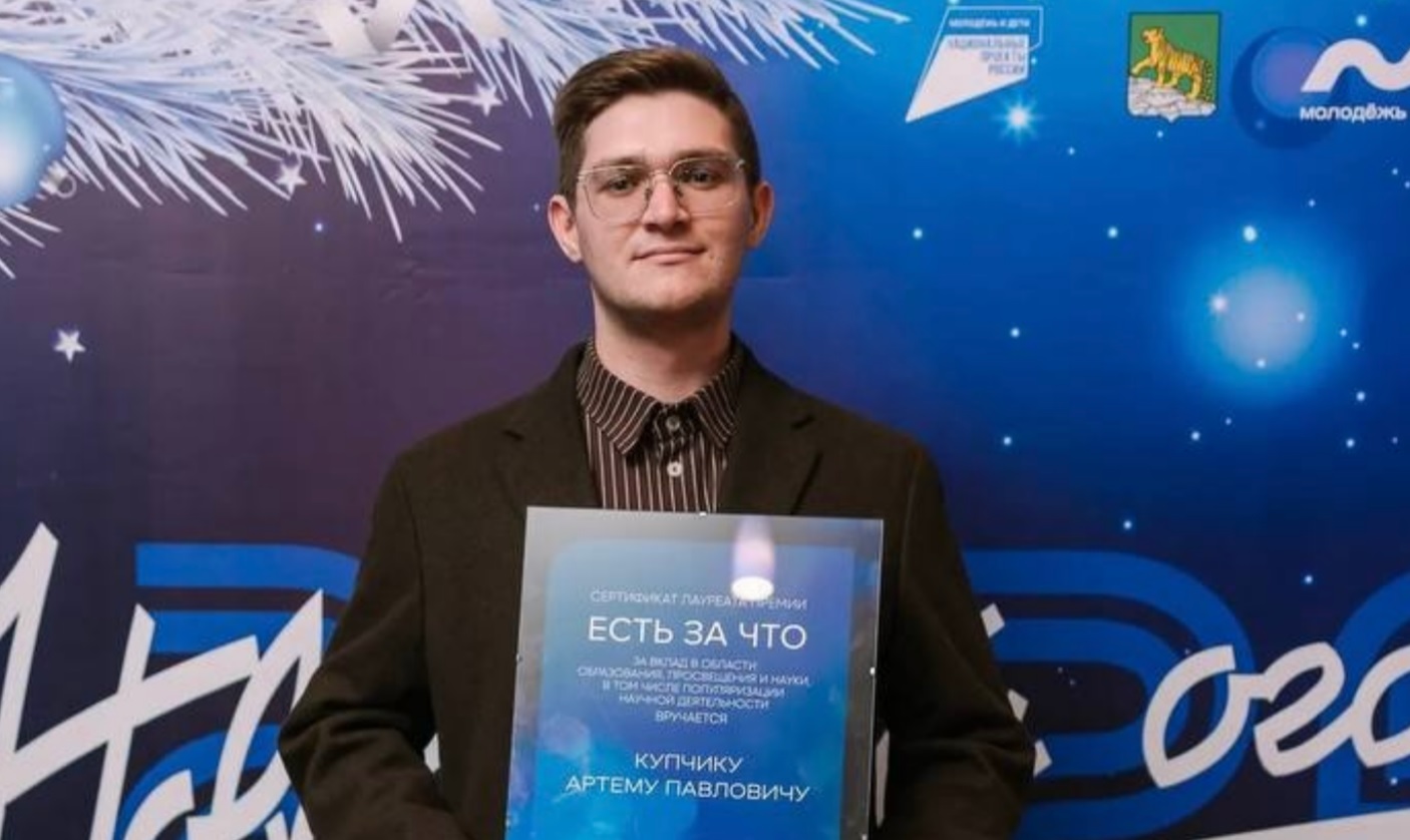 На торжественной церемонии награждения сертификат на 100 тысяч рублей и памятную статуэтку из 125 претендентов получили 15 человек. В числе лучших – Артём Купчик, ассистент кафедры экономики и управления, организатор регионального чемпионата по управлению бизнесом «Первый предпринимательский», в котором приняли участие более 1000 школьников Приморья