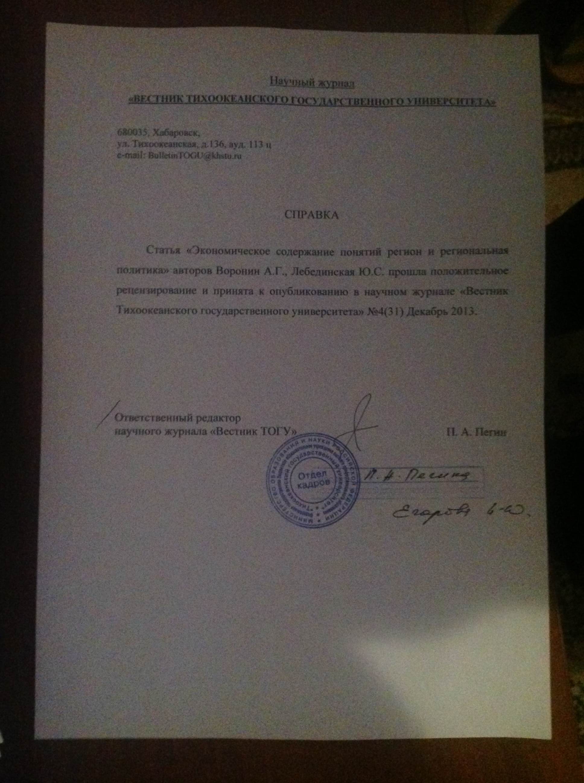 Вестник Тихоокеанского государственного экономического университета